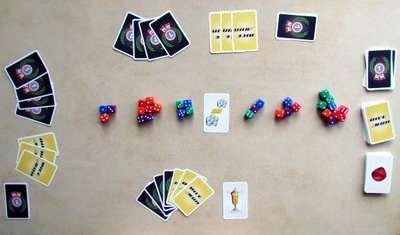 30個のサイコロを全部振って結果を見た後、ターゲットカードをよく切って各プレイヤーに配り、見られないようにします。