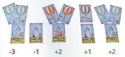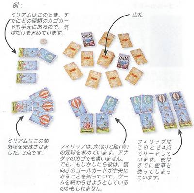 それに乗っている冒険者は1人1点です。完成した熱気球は同じ色は手元に置けない」ルールの対象からはずされます。