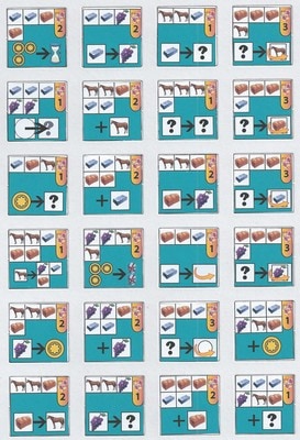 資源の収集:生産地カード上のワーカーを移動させ、ワーカーが置かれていた生産地を裏返し、到着したカードの資源を獲得した後、ワーカーと矢印の向きがあっていればさらに移動させて資源を獲得できます。