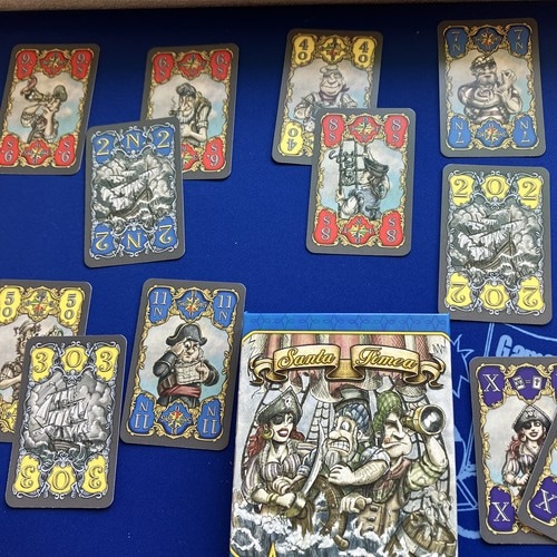 「サンタ・ティメア」は、荒々しい航海をテーマにした、風向きに応じて出したカードの数字が可変する、メイフォローのトリックテイキングゲームです。