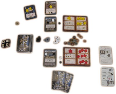 コインとキューブをテーブル脇に置いて共通サプライとし、プレイヤーは帝国カード1枚と初期砦1枚を取り自分の前に置きます。