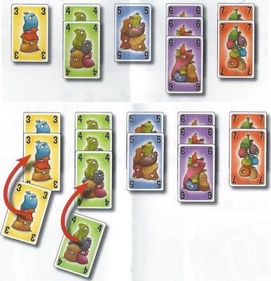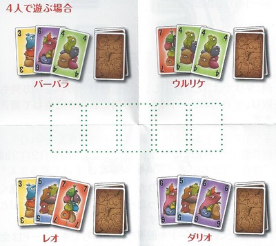 手番の間に、各数字の列と同じ枚数に出来たプレイヤーは、その列にあるカードを獲得て手前においておきます。