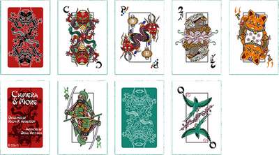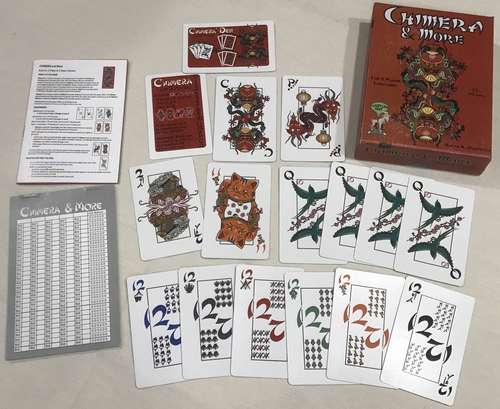 「キメラ&モア」は、カードプレイでどれだけの成果があげられるかを推測し、キメラになるかキメラハンターとなるかを判断するゲームです。5人ルールが拡張されます。