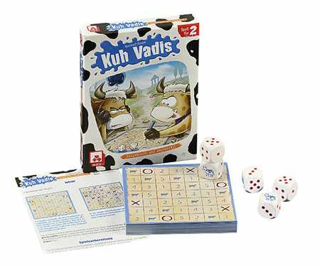 「クーヴァディス」は、ダイスを5個振りウシ目か数字を規定数使い、縦横斜めにつなぎボード上で陣取りを行う2人用のダイスゲームです。