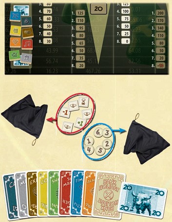 紙幣を準備し、アクションタイルを袋に入れ、移動タイルを別の袋に入れ脇に置きます。