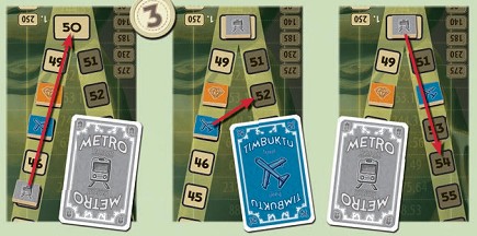 銀行休業が出されていなければ、順番に対応した会社マーカーを進めます。移動タイルの数分だけ進めます。