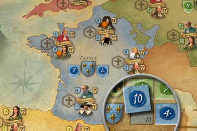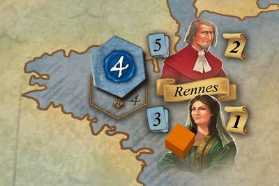 手番の終了時に表向きのカードを3枚に補充できなかったら時代が終了します。4つの国それぞれについて影響力の高い2人のプレイヤーに1位と2位の勝利ポイントが与えられ、国について保有している役職の影響力を獲得します。