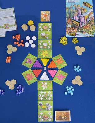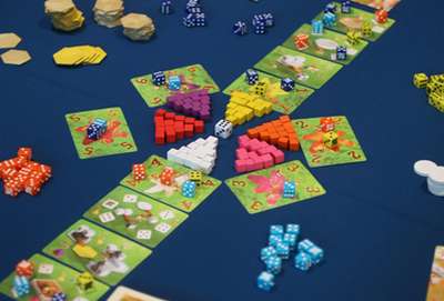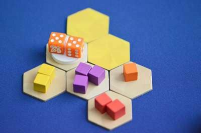 昼フェイズでは各プレイヤーは自分のサイコロを振り、その目に応じてアクションカードもしくは自分の蜂の巣にサイコロを置きます。