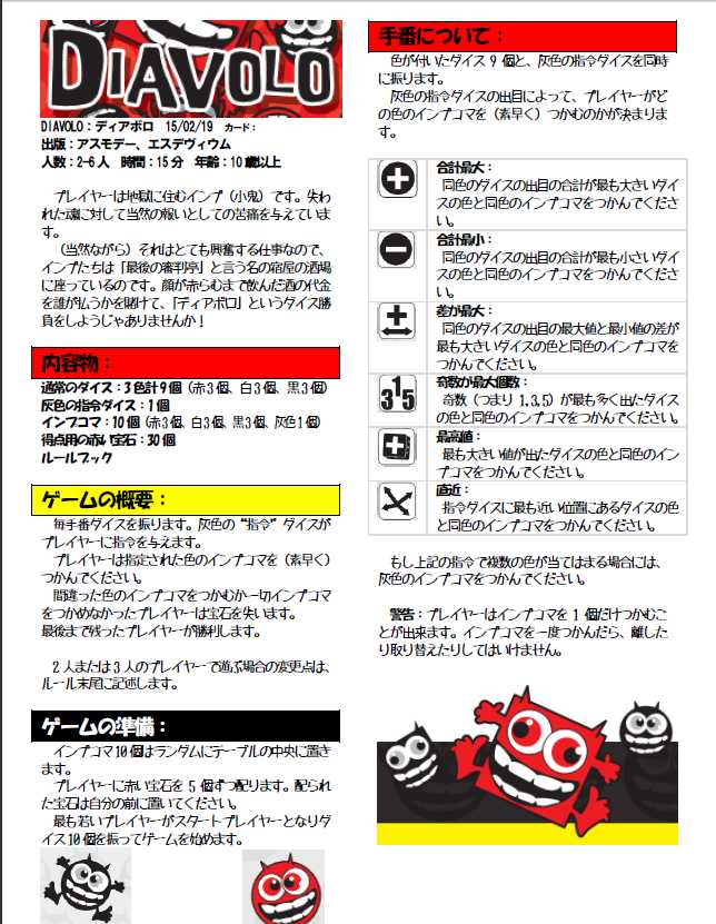 (当然ながら)それはとても興奮する仕事なので、インプたちは「最後の審判亭」と言う名の宿屋の酒場に座っているのです。顔が赤らむまで飲んだ酒の代金を誰が払うかを賭けて、「ディアボロ」というダイス勝負をしようじゃありませんか!