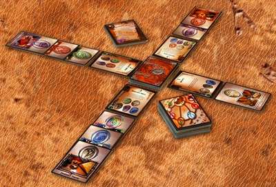 スペルデッキはプレイエリア中央に置き、材料デッキは端に置き、材料デッキから各プレイヤーにカードを5枚ずつ配ります。