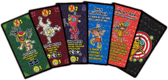 「ヴードゥー」は、他プレイヤーに呪いの効果を面白おかしく適用させるために、ダイスの役をそろえるコミュニケーション系のダイスゲームです。