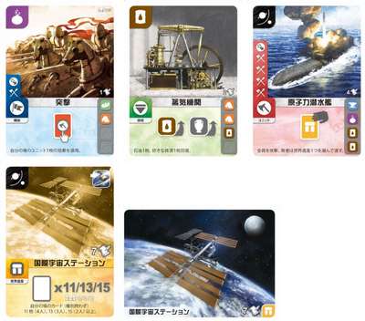 3、公共の場から文明カードや世界遺産カードを1枚だけ購入でき、その購入コストをエネルギーを資源カードなどを消費させます。購入したカードを自分の場に配置し、軍事力などの数値を調整します。