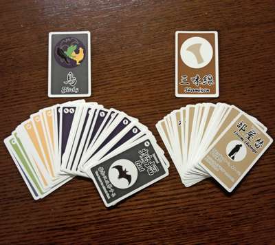 鳥カードと三味線カードをよく切り、全員に鳥カードを3枚と三味線カードを2枚受け取り、鳥カードは表向きにし、三味線カードは手札にします。