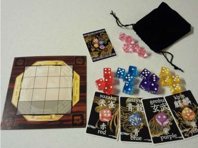 全てのサイコロを大きな袋に入れ、袋から4つサイコロを無作為に出して、四隅の角に置きます。