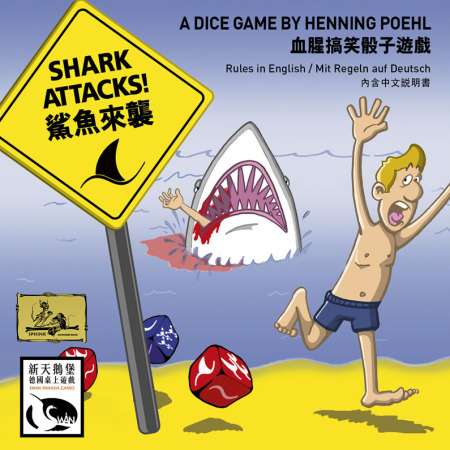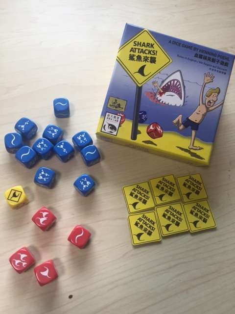 「サメ襲来!」は、ファッショナブルなリゾートビーチにて、観光客をサメから守り切るか、ビーチが血の海に染まるかのダイスゲームです。