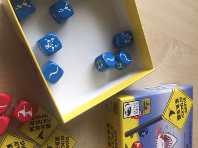 既に泳ぎ始めている観光客の人数と同じ数の海岸ダイスをテーブルの中央から取り、さらに赤色のサメダイスを加え、振って判定します。