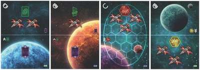 戦闘:向き合っている区画では、最初に火力の設定を行い、見えている戦闘機に対応するダメージトークンを準備します。その後イニチアシブコマを持つプレイヤーから順番にダメージを分配します。ダメージトークンは上から下の順に配置し、最後の戦闘機にダメージが配置されたときにそのカードは捨て札となり、上段部分が公開されて様々なカードのその効果が適用されます。全ての区画が破壊されたら、残るダメージ分だけ装甲が破壊されます。ダメージトークンはラウンドをまたぎます。戦闘終了時にイニチアシブコマを持つプレイヤーは相手に渡します。