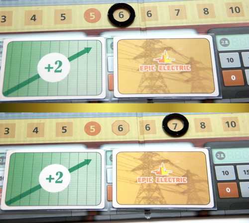これにより株価が10に達したら、株式の分割が起こります。また株価が1を下回った場合はその企業は倒産し、倒産した株券をすべて捨て札にします。これらの処理の後に、既定の株価に戻ります。