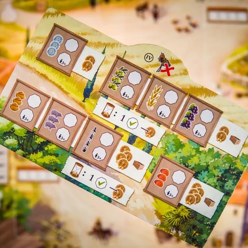 村の工房に配達する:各プレイヤーは6カ所ある工房のいずれにも資産を配達する事が出来ます。各工房には資産のシンボルが描かれた行が、プレイヤー1人につき1行あり、自分の資産や木箱を自分の農園から1個取り、工房の”自分が担当する”行にプレイヤーマーカーを1個置きます。最初に配達を完了させたのであれば勝利点を獲得します。工房に対して配達を完了させたらその工房に関連する技術マーカーを1枚獲得します。
