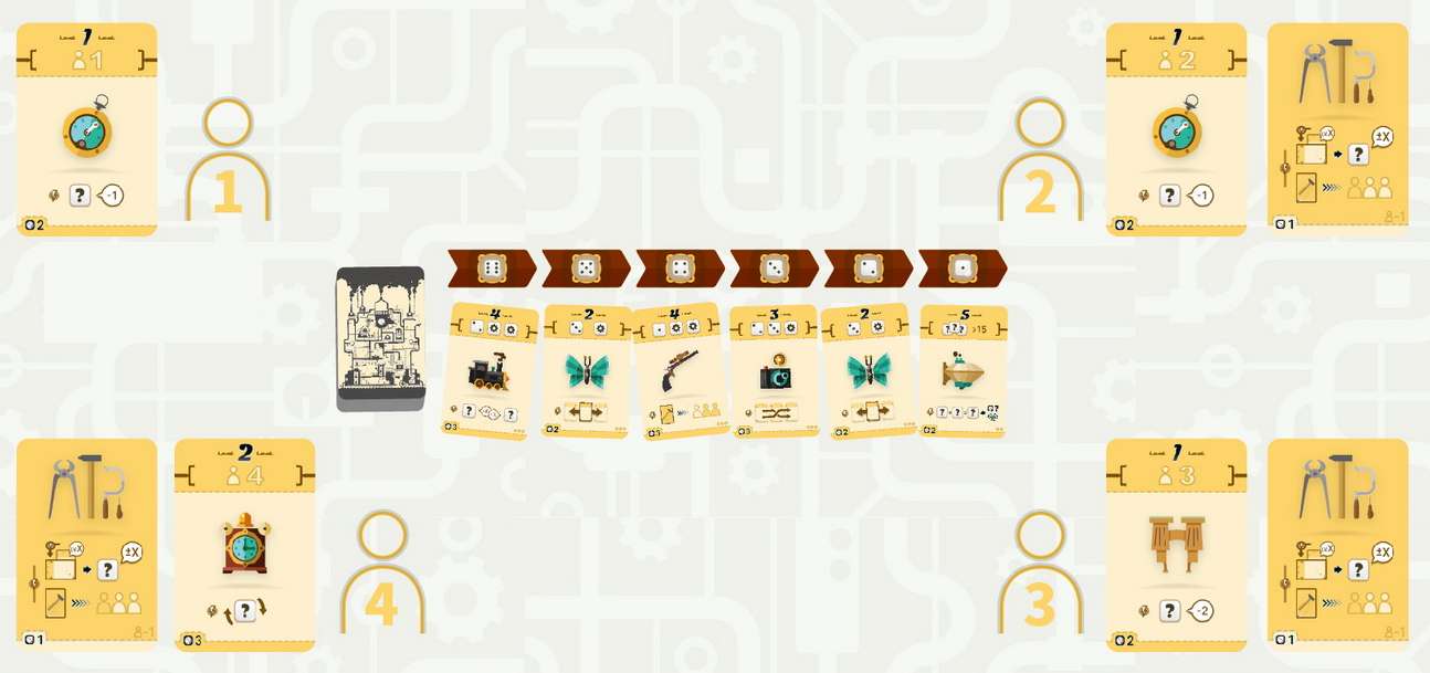 発明:サイコロを1個使い、発明序列からその出目の数に応じた項目マークの下にある道具カードを、満タンの状態で手前に持ってきます。