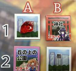 キャラクターカードを表向きにして並べ、キャラクターコマをスタート地点に置きます。