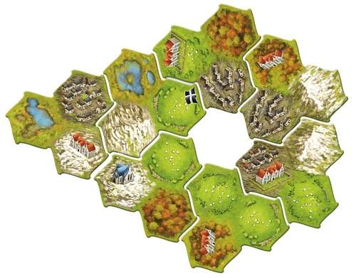 酒場を準備し、地形タイルをよく混ぜて山札にし、コテージを組み立てて脇に置き、スタートタイルを中央に置きます。