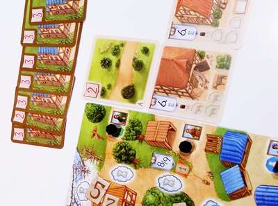 教会カード、議事堂カード、待合所カード、修道士カード、畑カード、買い物客カード、旅カード、職人の建物カードをそれぞれ初期状態に準備します。2/12タイルを待合所に置き、各プレイヤーに村ボードをランダムに渡します。
