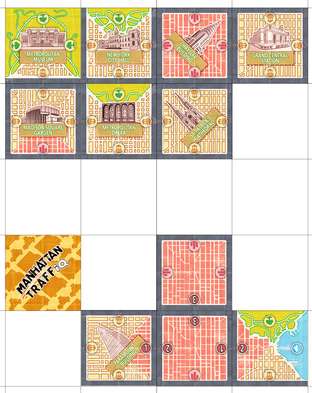 「マンハッタントラッフィク」は、は、トラックとタクシーを配置し、マンハッタンの道路で人物と商品の交通で儲かるルートを競います。