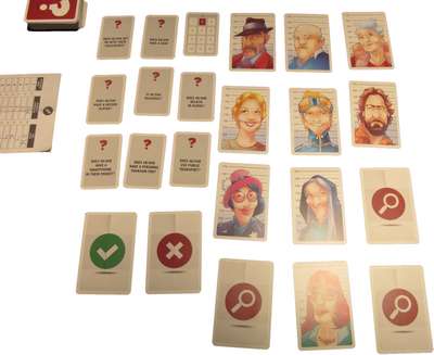 質問カードを混ぜ山札にします。犯人カードをよく混ぜ12枚を引き3x4に並べ、容疑者グリッドを構成します。