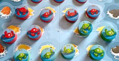 各プレイヤーは1色を選び、選ばれた色のカニのコマをよく混ぜて、スタート地点に配置します。