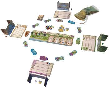 ボードを組み立て、各プレイヤーは1色を選びプレイヤー用具と銀貨を1枚受け取ります。