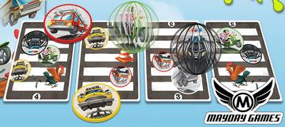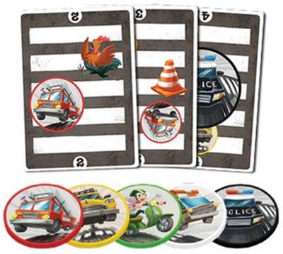 裏向きに並べられた道カードの、赤信号の下にある乗り物に一致する乗り物チップを使用します。