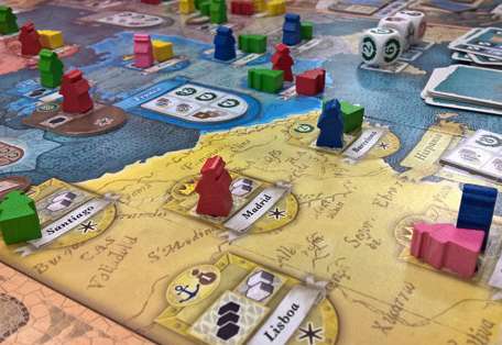 交易:交易エリアの中から1隻の船を選び、大小のマスの空いた場所に置きます。両方埋まったら、小の方に置いたプレイヤーが商品を2つに分配し、大の方がどちらを取るか決めます。それぞれストックに移動させます。取られたら、袋から5つの商品を取って空いた船に置きます。