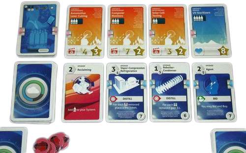 その後各プレイヤーの持つ最初のシステムとして、取り込みカードと還流カード、空気セットを2セット配り、よく切ってそこから5枚のカードを引いて手札にします。