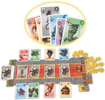 各プレーヤーが2枚ずつプレイしたら、国王から一番遠い護衛から戦闘判定を行います。その護衛を表にして、実際の戦闘能力をチェックします。モンスター2枚の戦闘能力の合計が護衛の戦闘能力以上ならばモンスターの勝ちです。守っている宝をこの2枚のモンスターが山分けします。そして次の護衛を表にして戦闘判定を行います。もしどこかで護衛が勝ったら、それ以降戦闘は起こりません。負けたモンスターとまだ判定が行われていないモンスターは、回復のため宝を捨てなければなりません。王に近い護衛と戦うには少しリスクが大きくなるのです。