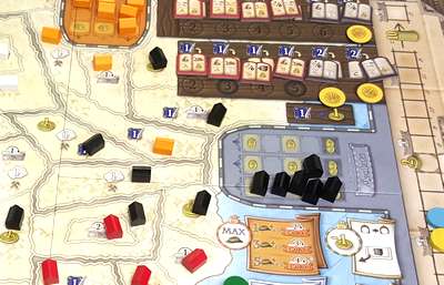 ・アクションエリアにある全ての探検カードを使う:探検カードを使用し、1つの会社拡大のために対応する交易所コマを、本拠地か既に交易所コマがあるマスに隣接するマスへ、探検値に応じて配置していきます。進出した地域に利益があれば、その利益を得ます。他の会社のコマがあればそれらのコマは本拠地へ戻されます。