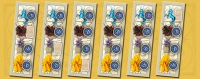 各プレイヤーは自分の色の腰部を持ち、スタートプレイヤーを決め、商品タイルを3つを置くまで商品タイルの準備を行ないます。