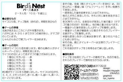 「バーズネスト」は、ダイスを振って対応する卵がある巣の重さを推測するゲームです。