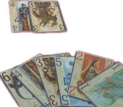 カードをよく切り、各プレイヤーは6枚ずつ裏向きに配り、残りは伏せてよけておきます。