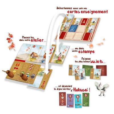 ・実践:学校にある授業カードの縦列を1つ選び、工房を広げたり版画を拡大したりの作業を行ない、条件を満たしたら対応する免状タイルを得ることができます。授業カードの列を獲得したら次のラウンドまでカードを得ることができず、獲得した授業カードを工房の改良か版画に任意の順番に追加します。版画の拡大をするためには絵筆コマを配置や移動させる必要があります。また工房にカードを追加したとき、絵筆コマやスタートプレイヤーコマを取れたりできます。