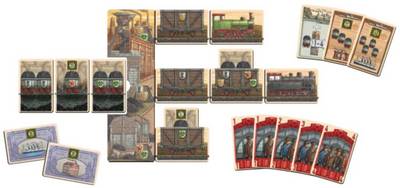 全てのカードを種類ごとに分け、テーブル中央にある共通のカードのディスプレイを準備します。トロッコカードを2つの山に分け、貨物車カードもその隣に2つに分けます。機関車カードをよく混ぜ山札にします。注文カードを機関車カードの脇に置きます。株式カード、革新カード、目的カードも準備します。