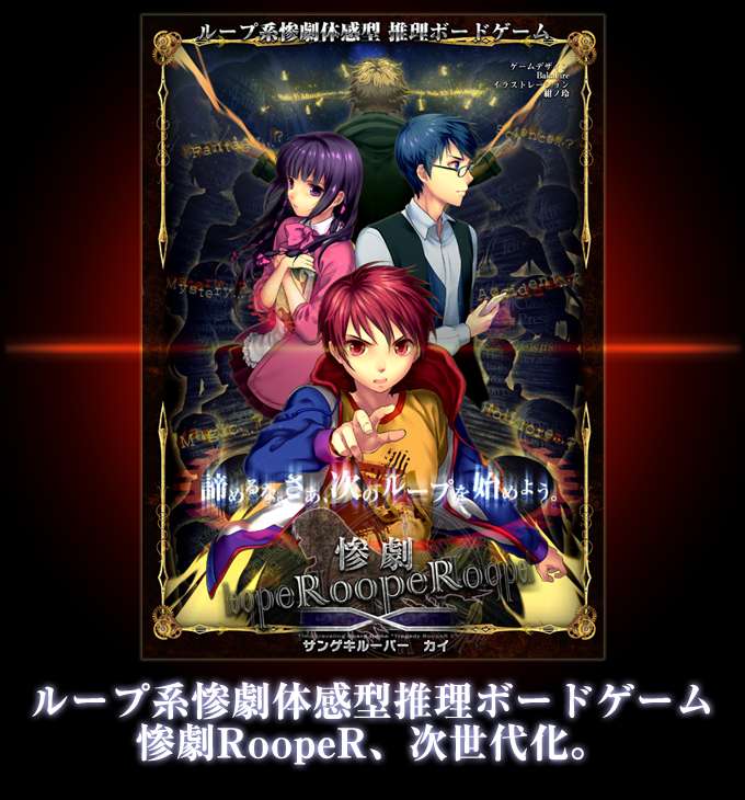 「惨劇RoopeR」は2人から4人用のシナリオ型推理ボードゲームです。1人から3人のプレイヤーは「主人公」となり、惨劇へと挑みます。