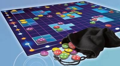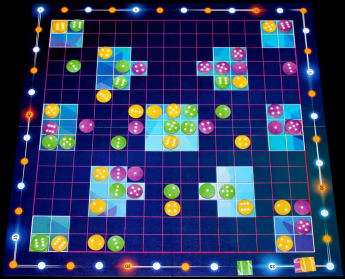 また、ちょうどチップが置けるところにほかのチップが置かれていたら(自分のものでも)その上に重ねて置くこともできます。ただし、既に2枚重ねられているところには、おけません。こうして、順番にチップを置いてゆき、すべてのプレーヤーが袋の中のチップを置き終わったらゲーム終了です。それぞれの明るい部分に置かれているチップの目の合計を比べて1番と2番のプレーヤーに得点が与えられます。