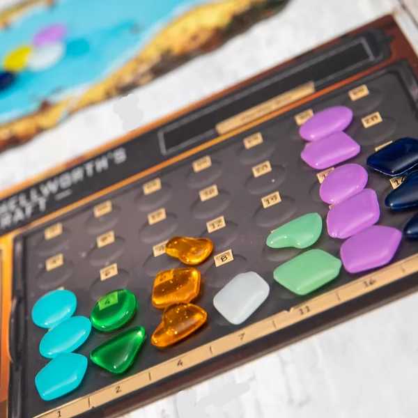 「リバーバレーガラス工房」は、ガラスのかけらを集めて、自分の店に戦略的に配置することを競うゲームです。