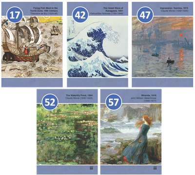 絵画カードをシャッフルし、プレイヤーそれぞれに5枚の絵画カードを配って手札とします。