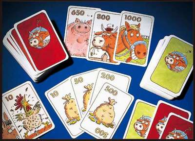 家畜カードをよく切り、お金カードを0が2枚、10を4枚、50を1枚を各プレイヤーに配ります。このお金は常に隠し持っておきます。またこのゲームにつり銭はありません。