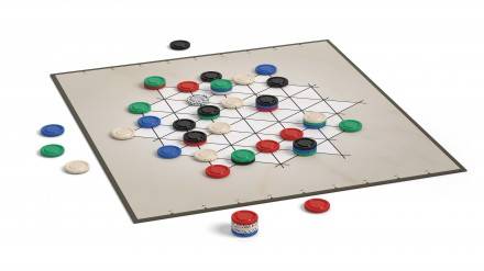 ボードを広げ、白以外の5色のコマを1個ずつボード横に並べて置きます。残りをボード上の交点にランダムに置きます。