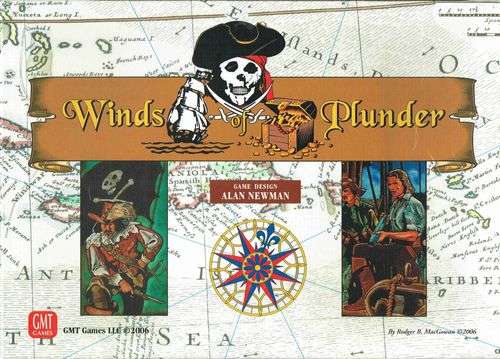 Set in the Caribbean at a time when pirates have naught to fear but each other, Winds of Plunder allows 3-5 players to compete for Victory Points (VP) by a variety of means: plundering ports, spreading their fierce reputations in the Caribbean isles, finding buried Treasure, and boarding their opponents. Randomly placed VP tiles dictate the value of each port and the location of Treasure Maps, while a unique tile rotation system helps keep game play fresh. Weapons, Crew, and Provisions may also be found in the various ports, each of which confers its own Advantages during the game and translates to VP's in the end. Action cards enhance a player's ability to gain plunder or to forestall his opponents. Wind Cubes permit players to vie over control over the winds that guide movement and the order of play for each game round. But the clock is ticking on the days of easy piracy! The game lasts 9 rounds, or approximately 60-120 minutes.