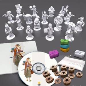 拡張の「四つ辻」も同梱され。コマもフィギュアやメタルコインとなります。