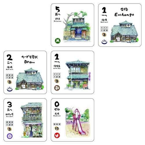 建物をアイコンごとに分け、ゲームの長さに応じたいくつかの裏向きの山にします。